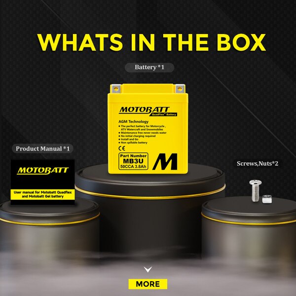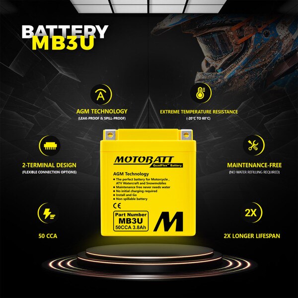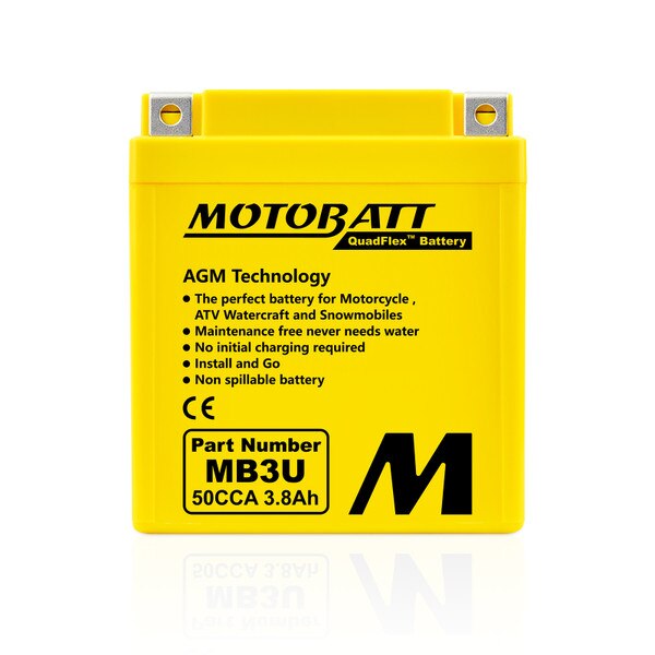 Battery Motobatt AGM MB3U Motobatt Quadflex offers the best balance between AH (ampere hours) and CCA (Cold Cranking Amps -18C). Achieving this by increasing the size of the internal plates, by utilizing the unused space found in other batteries. This is made possible through our world wide patented innovated cell connection system. Additionally, we enhance the thickness of the grid, the density of the paste, and the weight (content) of the active material to maximize the capacity allowed by its size. Revolutionary to the Battery Market. Unique BenefitsPower Experience up to 30% more capacity and power with the same size as competitor batteries, thanks to its exclusive design Safe No need to add acid and risk any accidental spillages Durable Thanks to its technology and high quality AGM it is extremely resistant to vibrations or weld breakages Maintenance Free Fully sealed and factory activated, it requires no maintenance other than keeping it charged in storage Ready to go With a voltage of over 12.5V the battery is ready to use right away New improved solid mounted terminals with threaded insertsAll Motobatt Quadflex batteries have a 24 Month Full Replacement Warranty*
