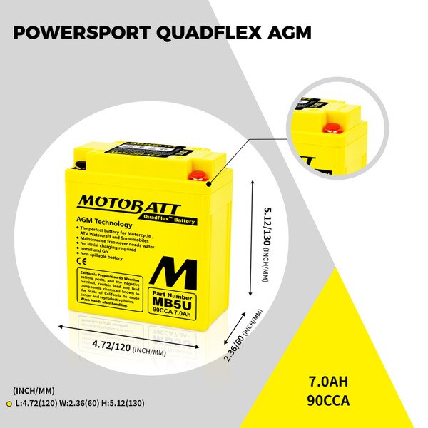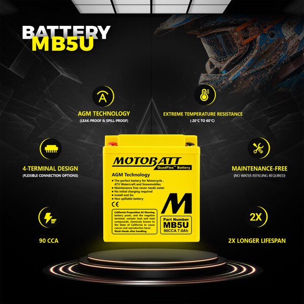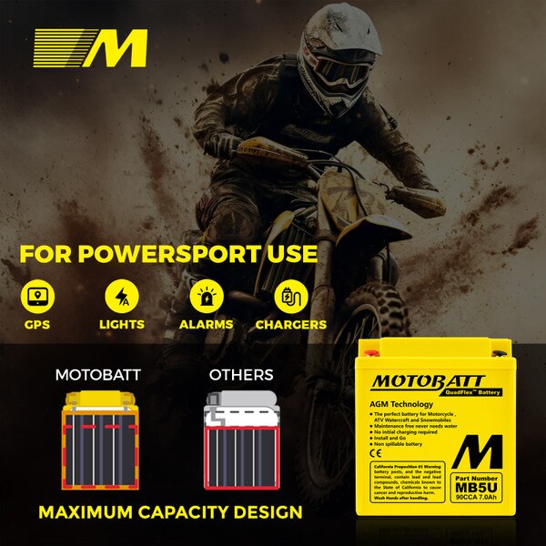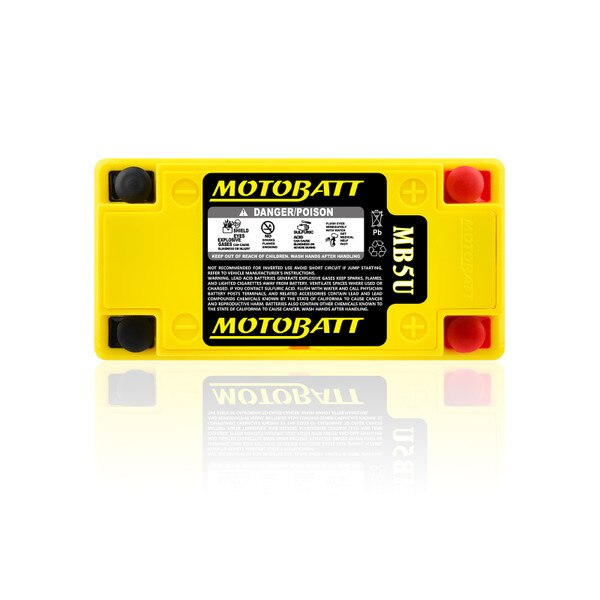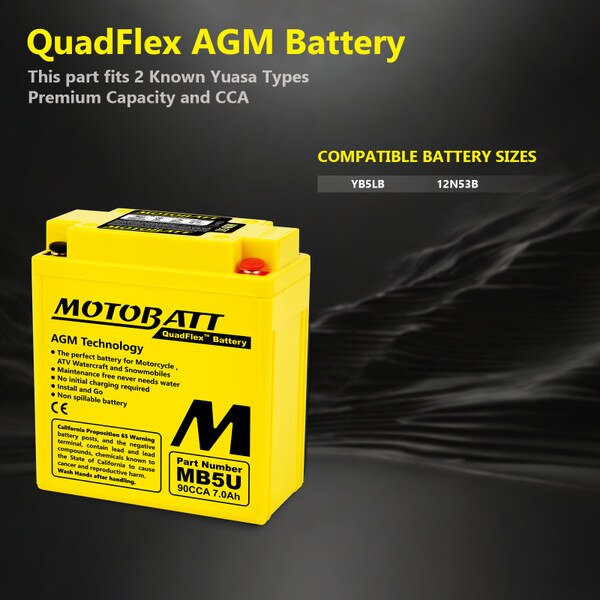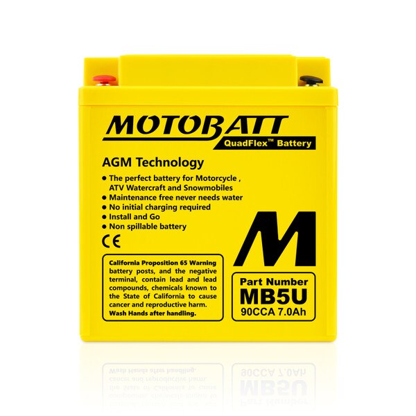 Battery Motobatt AGM MB5U Motobatt Quadflex offers the best balance between AH (ampere hours) and CCA (Cold Cranking Amps -18C). Achieving this by increasing the size of the internal plates, by utilizing the unused space found in other batteries. This is made possible through our world wide patented innovated cell connection system. Additionally, we enhance the thickness of the grid, the density of the paste, and the weight (content) of the active material to maximize the capacity allowed by its size. Revolutionary to the Battery Market. Unique BenefitsPower Experience up to 30% more capacity and power with the same size as competitor batteries, thanks to its exclusive design Safe No need to add acid and risk any accidental spillages Durable Thanks to its technology and high quality AGM it is extremely resistant to vibrations or weld breakages Maintenance Free Fully sealed and factory activated, it requires no maintenance other than keeping it charged in storage Ready to go With a voltage of over 12.5V the battery is ready to use right away New improved solid mounted terminals with threaded insertsAll Motobatt Quadflex batteries have a 12 Month Full Replacement Warranty*