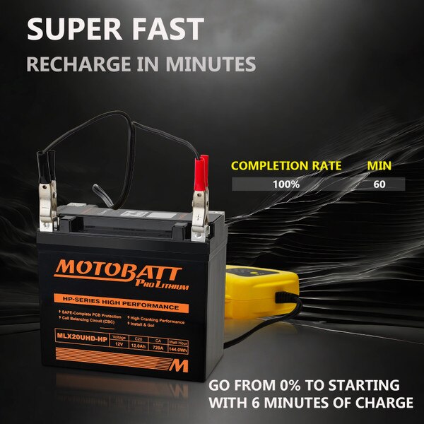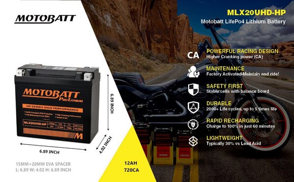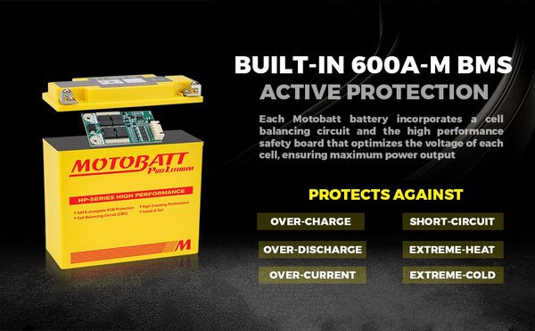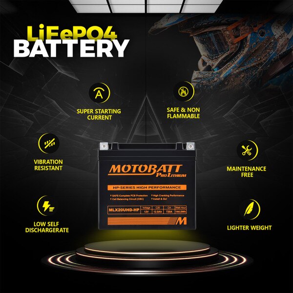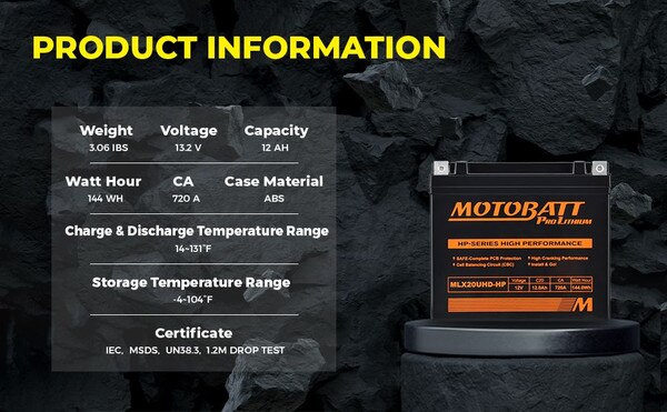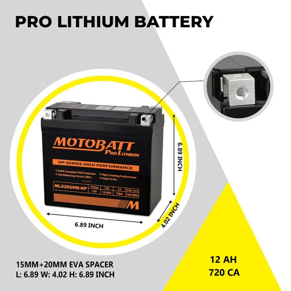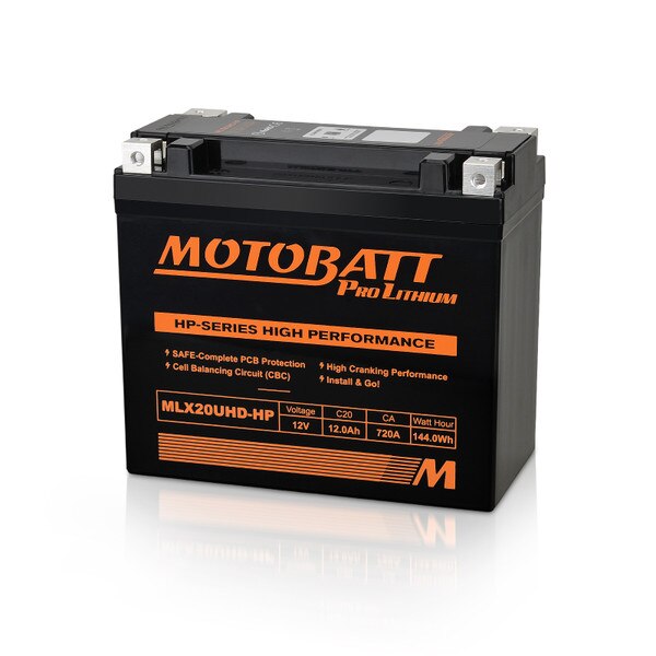 Battery Motobatt Lithium MLX20UHD-HP 720CA ALL MOTOBATT LITHIUM BATTERIES ARE UL CERTIFIED FOR MAXIMUM SAFETY AND QUALITY Each Motobatt battery incorporates a cell balancing circuit that optimizes the voltage of each cell, ensuring maximum power output. The CBC is not found in many batteries in the market and it is very important for the following reasons A Grade cells only: Cell grading ensures the longest possible lifespan Optimized voltage: CBC ensures each cell in the battery is charged to the same voltage, which prevents overcharging and undercharging. This results in maximum power output and longer battery life Enhanced performance: The CBC helps to prevent voltage spikes and drops, which can damage the battery and lead to failures. The results in better performance especially in cold weather and under heavy load. Improved Safety: The CBC helps to prevent thermal runaway, this makes Motobatt Lithium safer to use Greater reliability: The CBC helps to extend the lifespan of the battery and prevent premature failure. You can count on your Motobatt for years to come. PCB Safety board In addition to the CBC, the high performance safety board has even more built in safety features controlled by Mosfet. Overcharge Protection: Prevents the battery from being overcharged, if the battery exceeds 15.4V the battery will switch off Discharge protection: Prevents the battery from being discharged too deeply, which can damage the cells. If the battery cell reaches 8V the battery will switch to limp mode and turn off. To resume use, just apply constant charge to switch on and recharge. Temperature Protection: Prevents the battery from overheating. If the temperature reaches 55C during charging or 75C during discharging, the battery will switch off. Additional features: Stops charging at 14.6V, for single cell over discharge protection, when the voltage reaches 9.4V, the discharge will stop, and the over-discharge protection will delay 9 seconds.