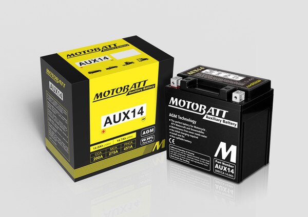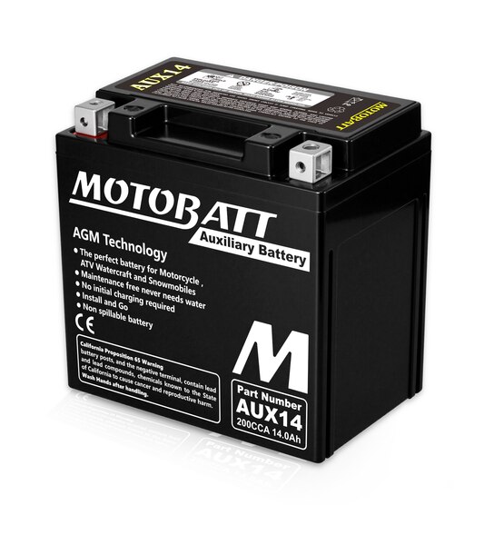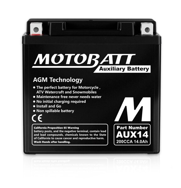Battery Motobatt AUX14 AGM Rated capacity: 14Ah CCA: 200CCA RC: 20RC BCI Group Size: 400 Prefixes MC replaces Yuasa AUX14, LEOCHE AUX14, CAMEL AUX14 Autocessking AUX14 Motobatt AUX14 FA (Factory Activated) series is a value orientated battery to compliment our Quadflex Premium range. With our same plate and pasting technology they offer comparable performance with the Factory fitted battery at a value price point. Standard terminal configurations with both lead and copper terminals chosen in each case for superior performance. Factory activation is the very best battery design since the process is controlled in house and immediately sealed while charged. Although you do need to maintain in storage, these batteries are designed to last years in storage so long as voltages are not allowed to drop below 12.4v on any regular basis. They have excellent recovery ability due to the more battery friendly chemistry inside the case. Features: Maintenance Free-No water to add, should be charged quarterly when not in use AGM-Absorbed Glass Matt separators-Vibration resistant, reduced shorting and mossing 99.99% Pure lead calcium plates, holds specific gravity much better than conventional battery plates Ships Factory Activated, no acid to add, just check voltage 12.85V and drive Designed for applications where Factory Activation and easy shipping and handling is required OEM fitment and Terminals FOR ALL AUX14 Automotive applications